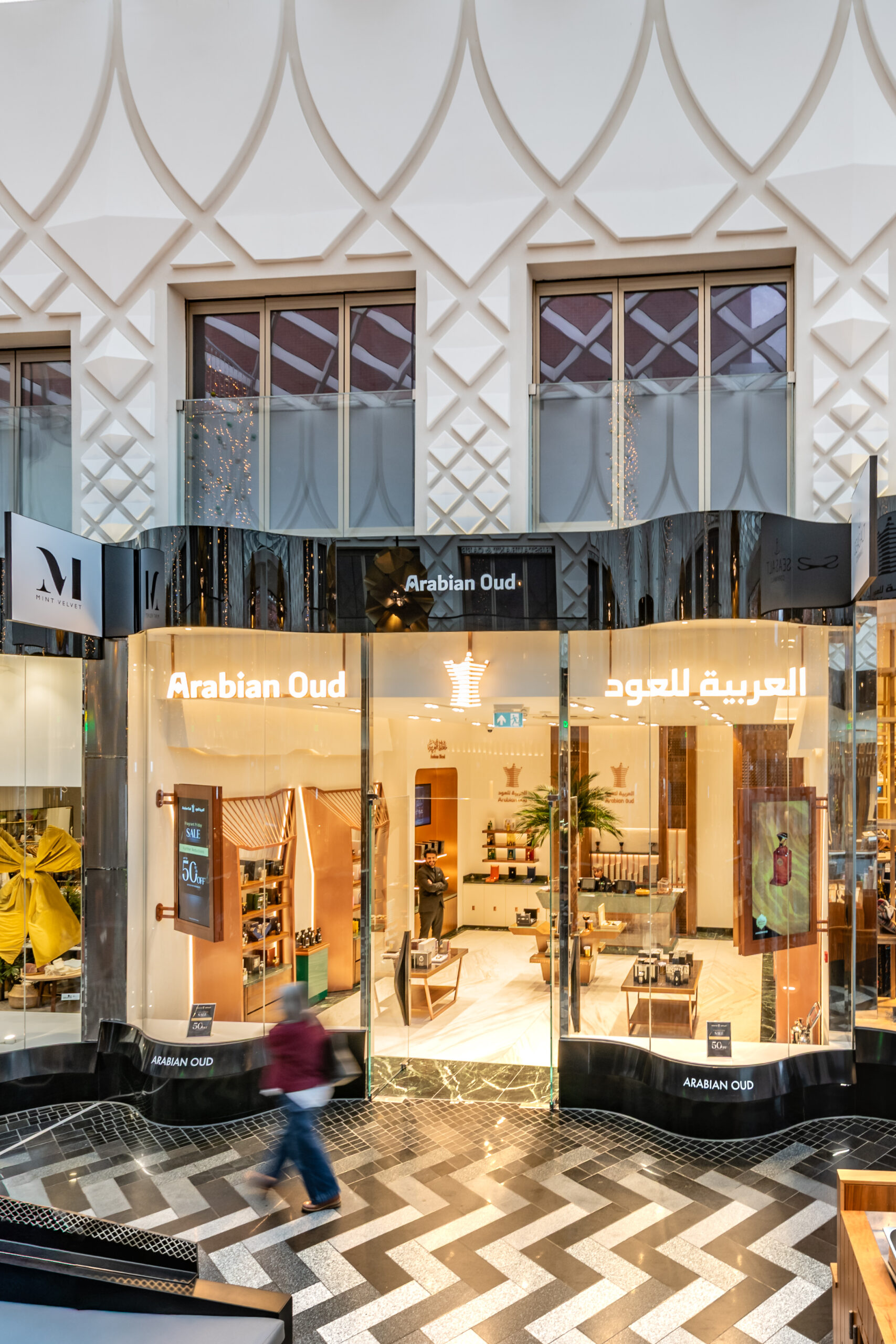 This project involved a full retail refurbishment and shop fit for luxury fragrance brand Arabian Oud, transforming the space into an elegant retail environment within the high-end Victoria Gate shopping centre in Leeds.