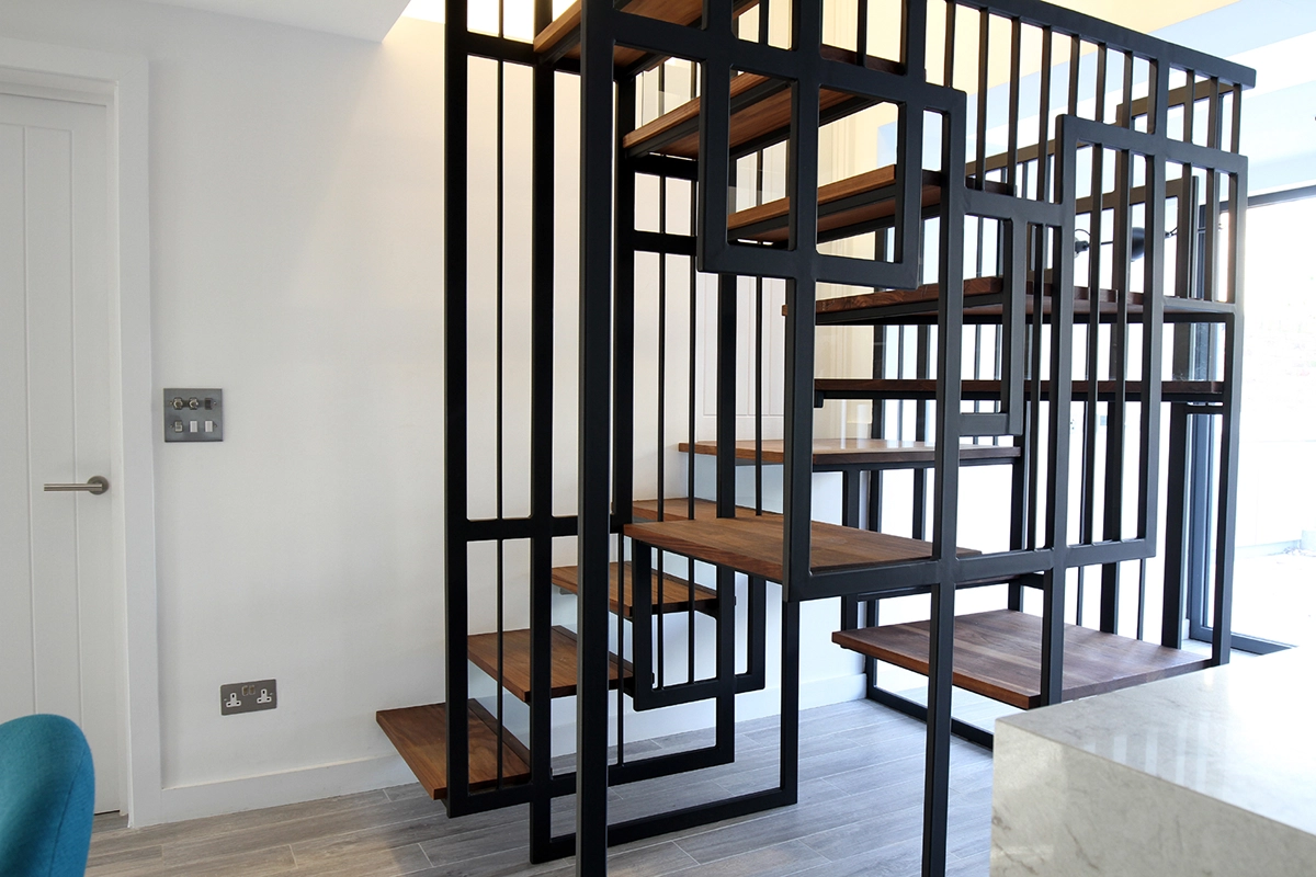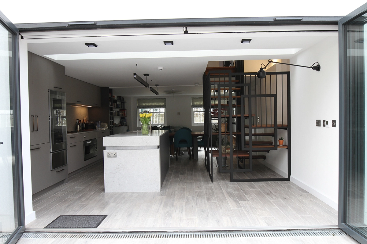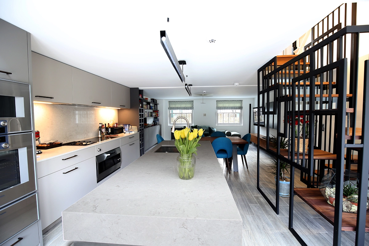 The space centres around a full kitchen refurbishment, tailored to the client’s lifestyle and finished with clean, contemporary materials. One of the standout features is the custom-built, industrial-style staircase — a bold structural element that brings an edge to the otherwise minimalist interior.