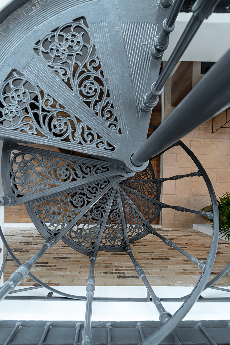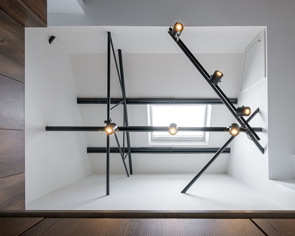 The flat is on two floors, linked by the spiral staircase and linked now also with a really thoughtful continuity in the interior design. Both floors use black metal light fittings as a bold, graphic accent. The kitchen lighting taking clever advantage of existing steel supports – is a particular success. The